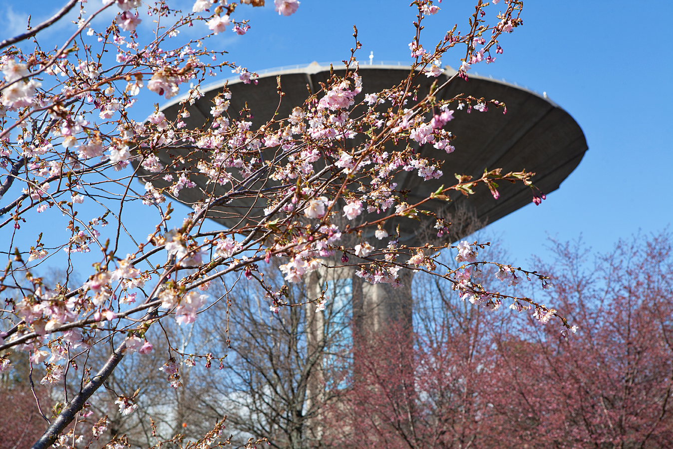 Alla fotografier är tagna under de senaste dagarna: Bofinken satt och sjöng i ett träd alldeles invid Vanda fors. | Påskliljorna blommar utanför vår terrass i Hertonäs strand. | Violerna prunkar i en kruka inne på samma terrass. | Kvällssolen skapar stämning i Södra hamnen. | Kasbergets vattentorn som magnifik scenografi åt körsbärsträdens rosa blomning.