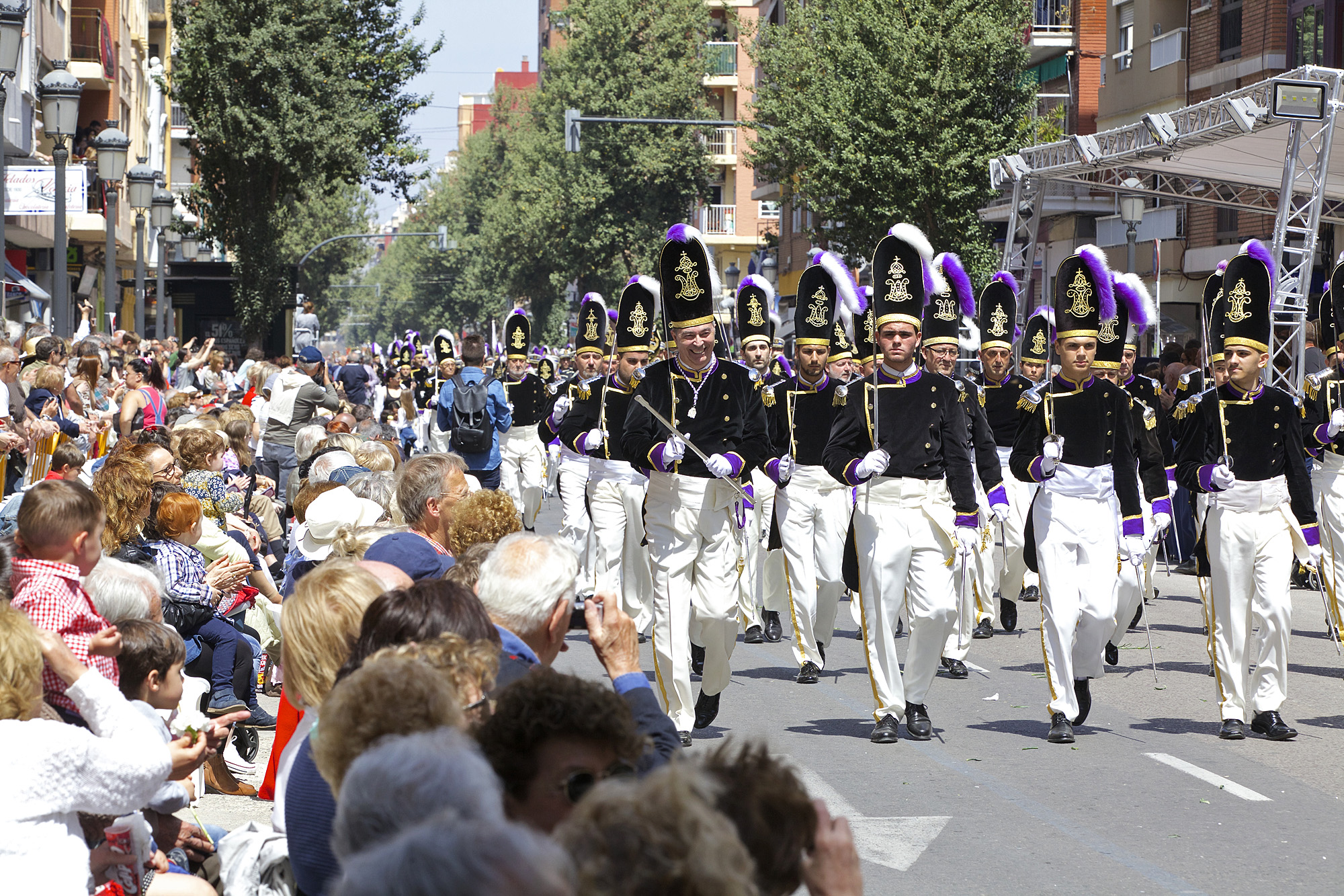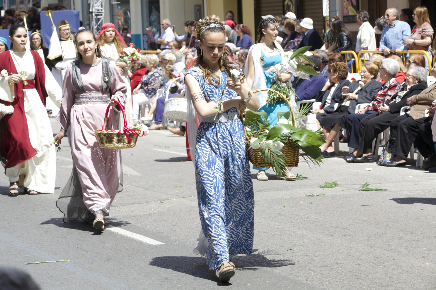 Och så strömmar de uppklädda aktörerna fram längs avenyn i små grupper: hästar, hornorkestrar, trumslagare, blomsterutdelare, barn, ungdomar, vuxna, Maria Magdalena, Lazarus och andra bibliska personer.