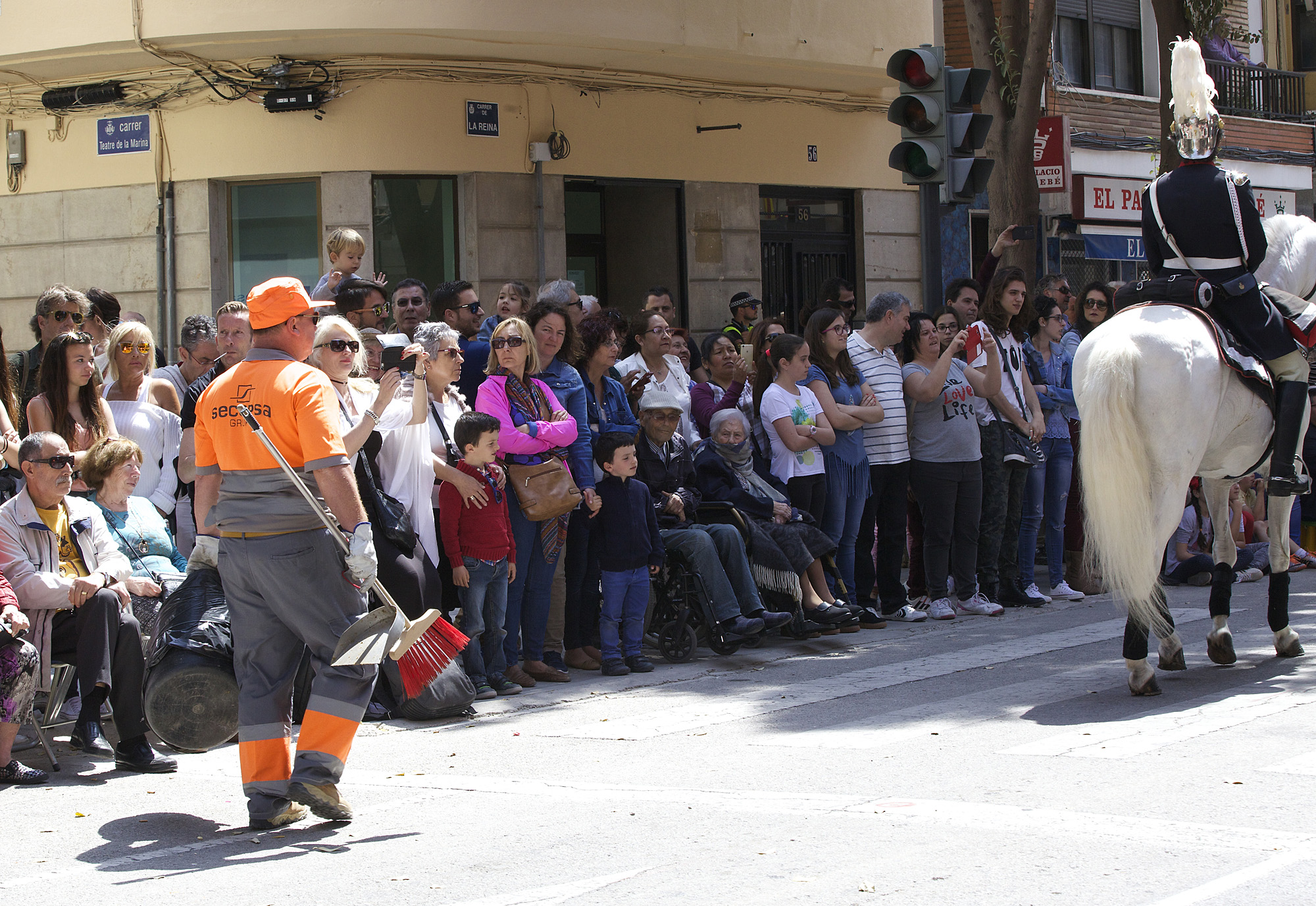 Söndag. Soldag. Påskdag! Semana Santa, den heliga veckan här i Valencia går mot sin höjdpunkt – den stora paraden. I god tid söker vi oss ner mot strandregionen och navigerar sedan mera precist mot Carrer de la Reina längs vilken processionen ska dra fram. Där har redan folkmassorna samlats, många med egna små stolar eller pallar – kanske de sitter ungefär på samma ställe varje år? I alla fall får jag en känsla av det här är välbekanta ceremonier och rutiner, ingen som skuffar eller trängs, bara ett smått improviserat kaos.